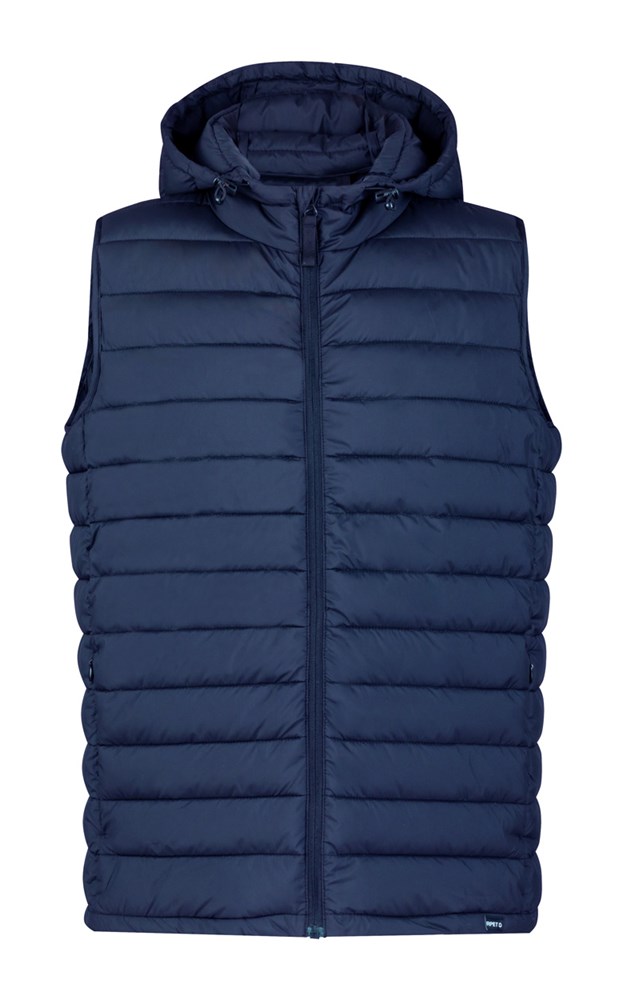 Wind- en waterafstotend bodywarmervest met ritssluiting, zijzakken met ritssluiting en verstelbare capuchon. Met RPET polyester zakje. 100% RPET-polyester met opvallend RPET-label.