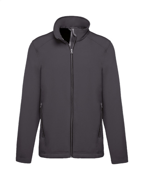 Dubbellaags softshell-jas met ritssluiting en zijzakken met ritssluiting. Met contrasterende ritsen. Waterafstotende stof. Buitenkant: 95% polyester en 5% elastaan. Binnenkant: 100% polyester micro polaire fleece. 300 g/m². Product van het merk Kariban.