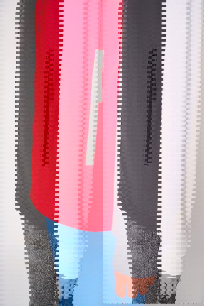 95% polyester / 5% elastaan. Softshell 2 lagen met waterafstotende behandeling. Binnenkant: zwarte micropolar van 100% polyester. Rechte snit. Twee zijzakken met polytricot voering, nylonritsen en zwarte ritstrekkers. Ritssluiting in zwart nylon met kinbescherming en ritstrekker. Schouder- en rugstukken met sierstiksels. Zwarte nektape aan de binnenzijde. Armsgaten en zoom afgewerkt met dubbele stiksels. Afneembaar merklabel.