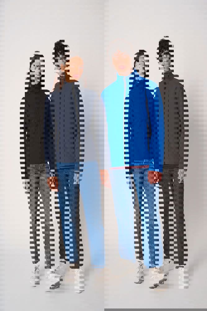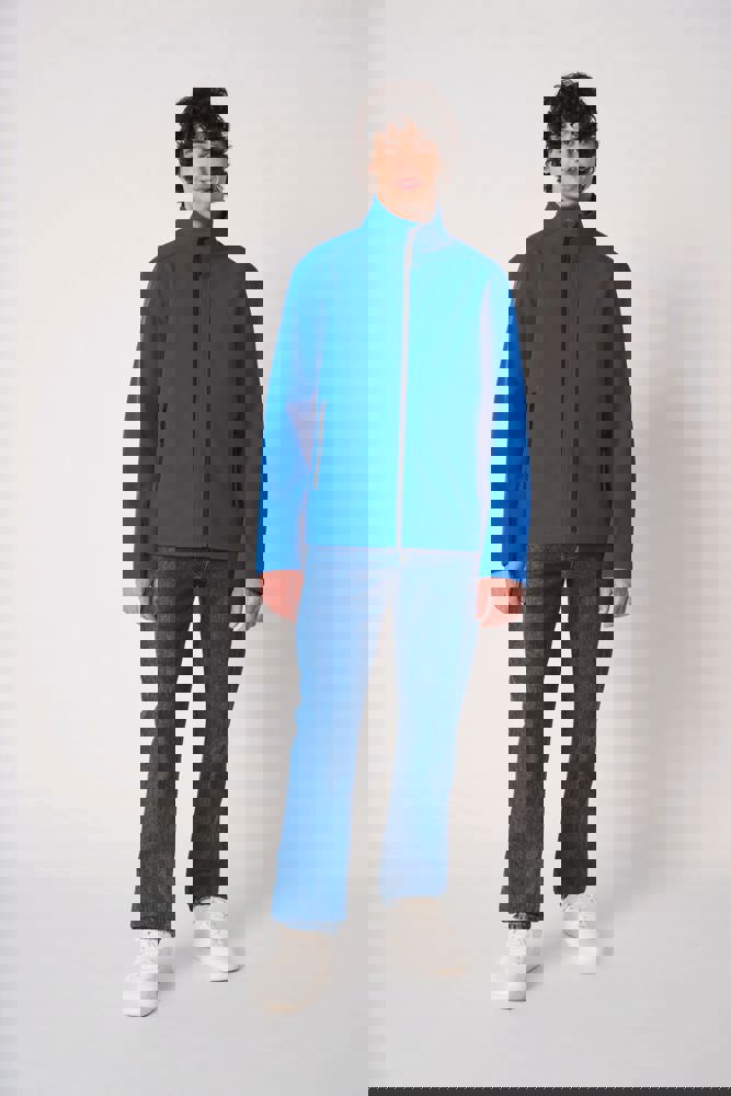 95% polyester / 5% elastaan. Softshell 2 lagen met waterafstotende behandeling. Binnenkant: zwarte microfleece van 100% polyester. Rechte snit. Opstaande kraag. Twee zijzakken met polytricot voering, nylonritsen en zwarte ritstrekkers. Ritssluiting in zwart nylon met kinbescherming en ritstrekker. Schouder- en rugstukken met sierstiksels. Zwarte nektape aan de binnenzijde. Mouwboorden en zoom afgwerkt met dubbele stiksels. Afneembaar merklabel.