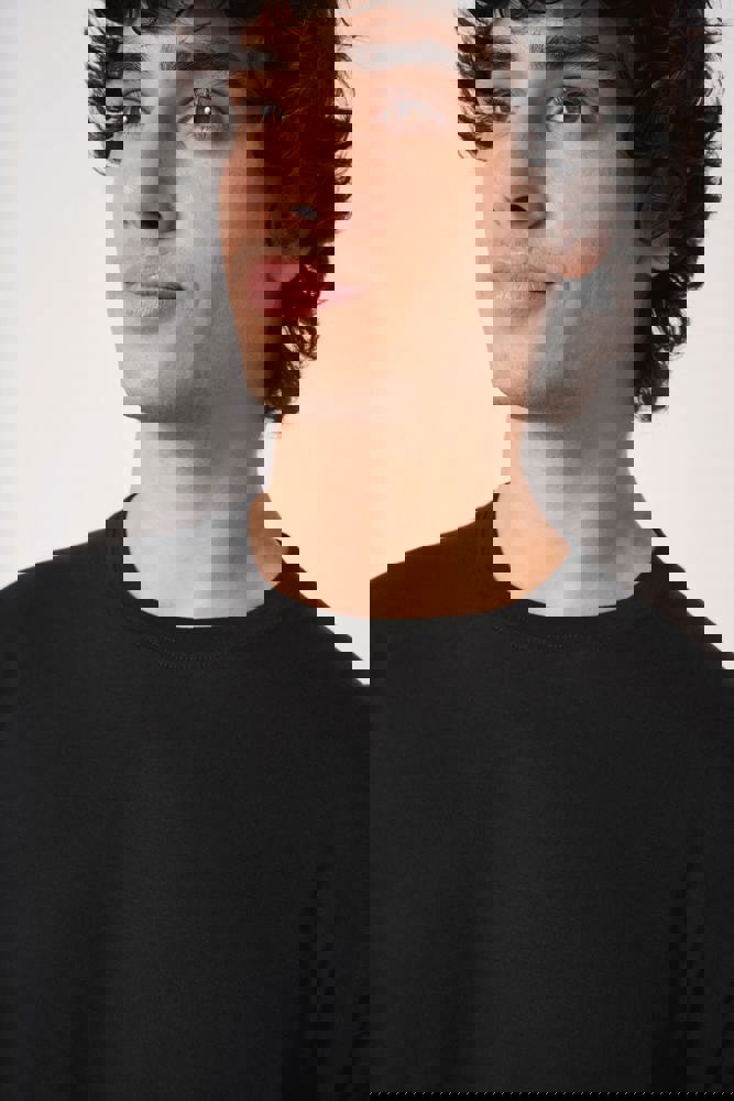 Effen kleuren: 100% katoen. Kleur Ideal Ash Heather: 99% katoen / 1% viscose. Kleur Ideal Oxford Grey: 90% katoen / 10% viscose. Tubulaire jersey. Rechte snit. Ronde hals in 1x1 ribboordafwerking met dubbele stiksels. Toon-op-toon nektape aan de binnenzijde. Mouwboorden en zoom afgewerkt met dubbele stiksels. Afneembaar merklabel.