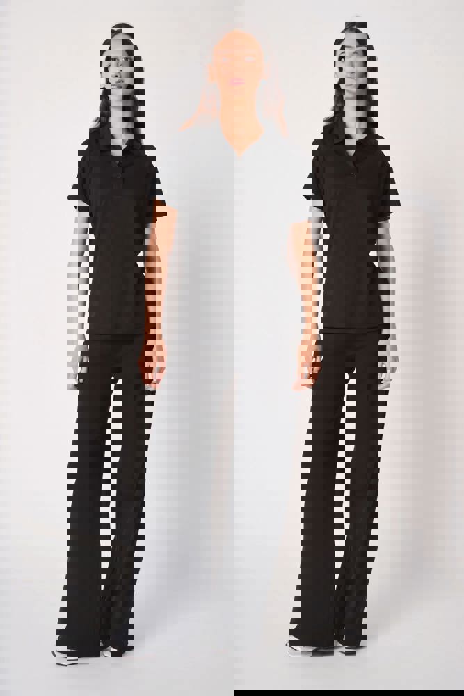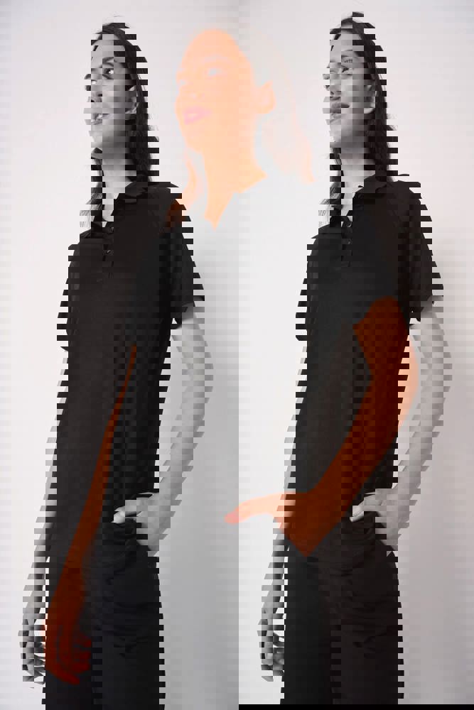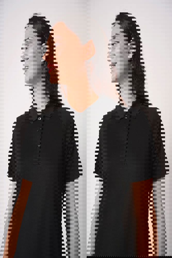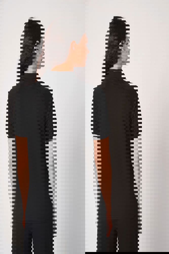 100% polyester. Mesh piqué breisel. Lichtgewicht, sneldrogende stof. Rechte snit. Raglanmouwen met flatlocknaden. Kraag in 1x1 ribboordafwerking. Sluiting met drie toon-op-toon knopen. Toon-op-toon nektape aan de binnenzijde. Mouwboorden en zoom afgewerkt met dubbele stiksels. Afneembaar merklabel.