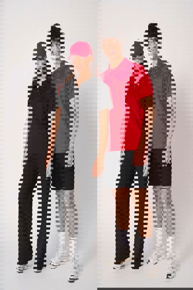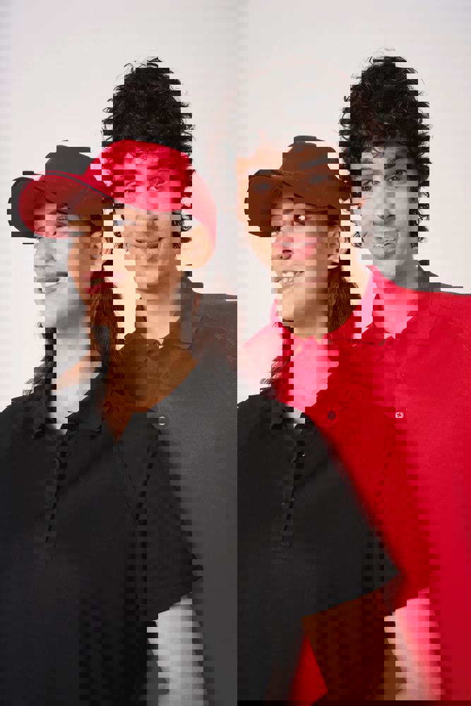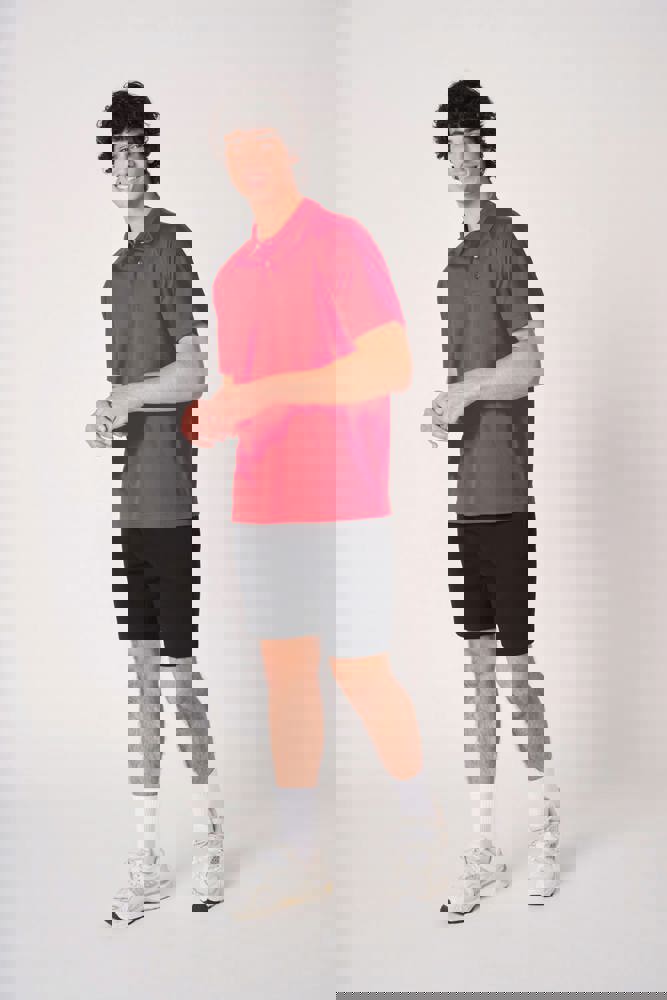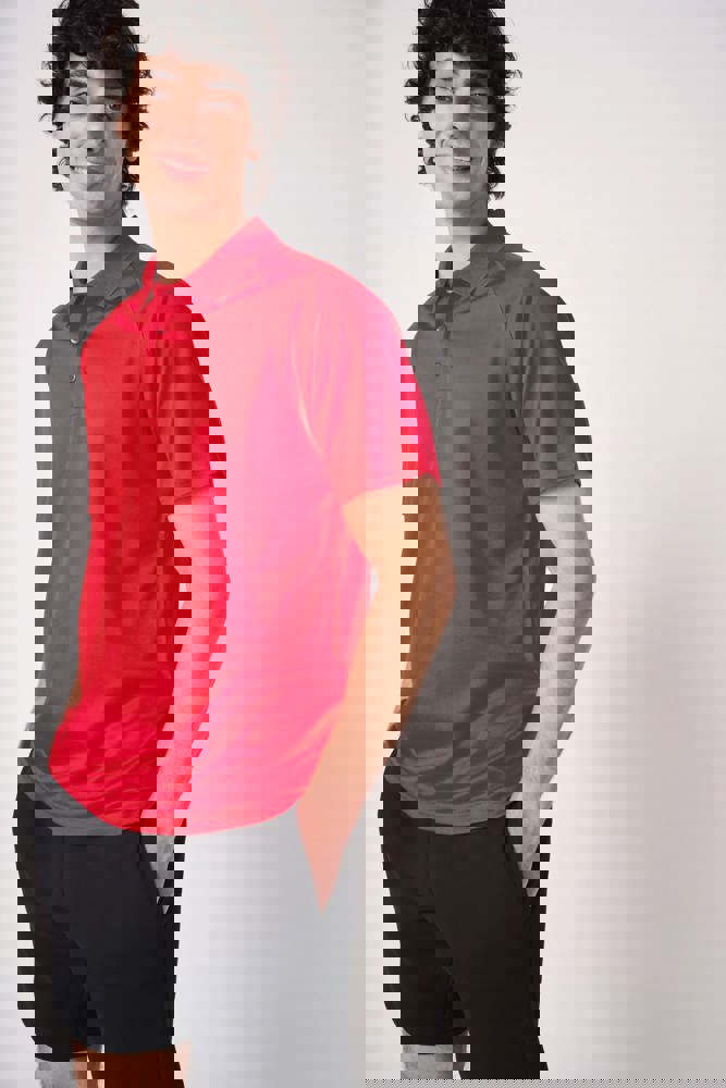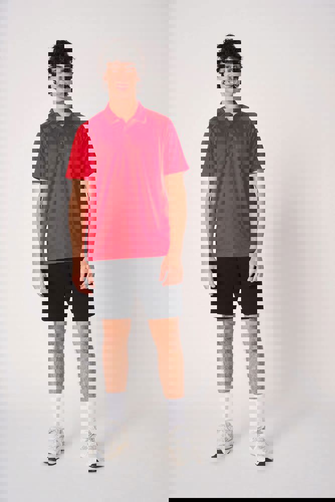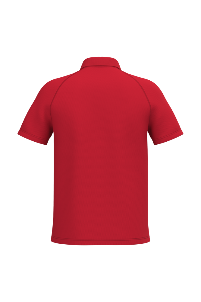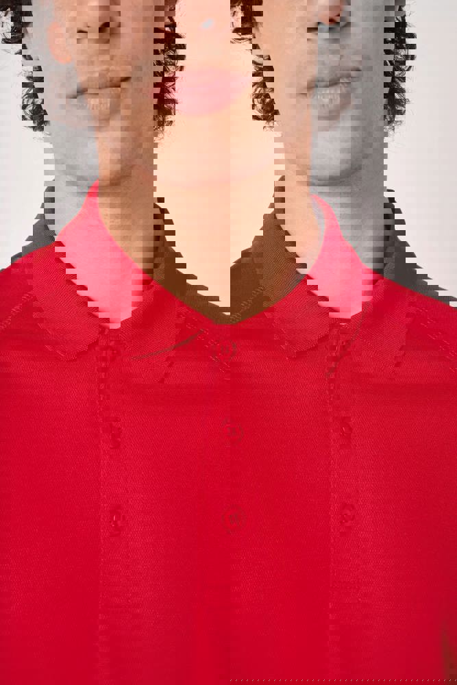 100% polyester. Mesh piqué breisel. Lichtgewicht, sneldrogende stof. Rechte snit. Raglanmouwen met flatlocknaden. Kraag in 1x1 ribboordafwerking. Sluiting met drie toon-op-toon knopen. Toon-op-toon nektape aan de binnenzijde. Mouwboorden en zoom afgewerkt met dubbele stiksels. Afneembaar merklabel.