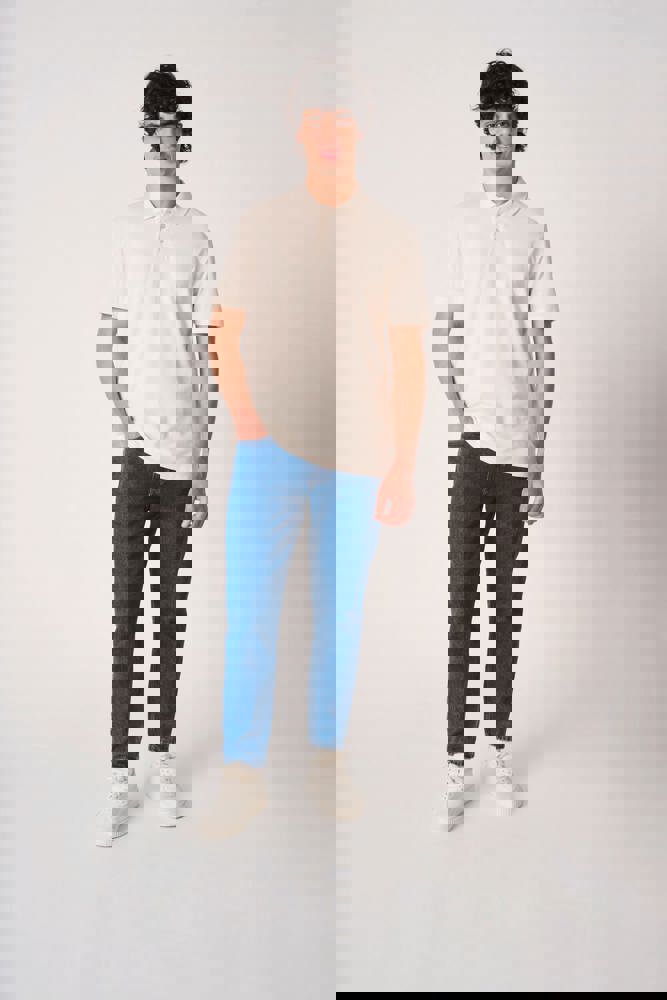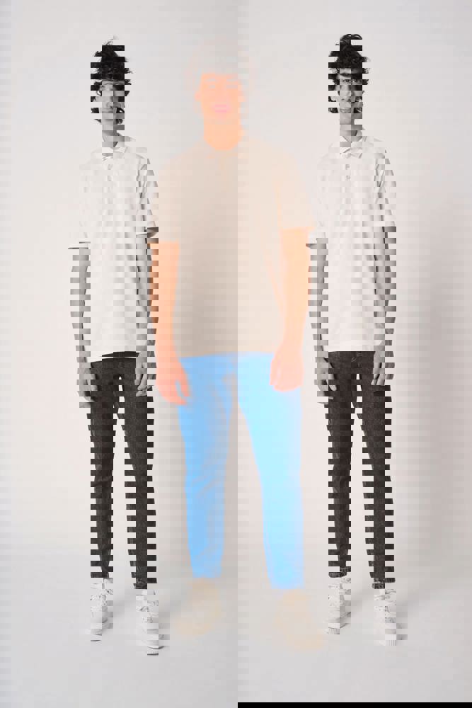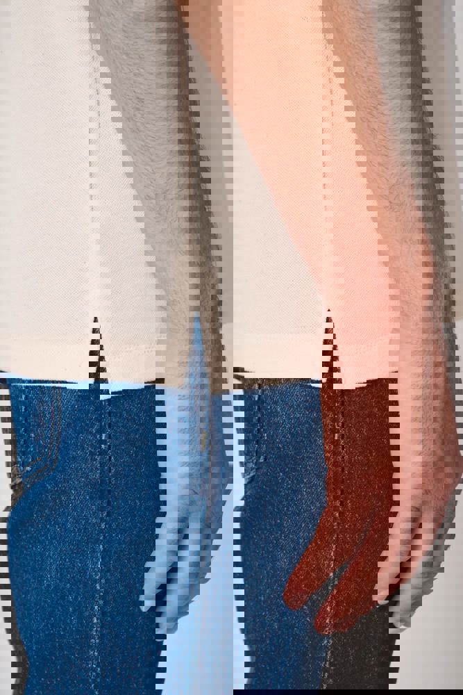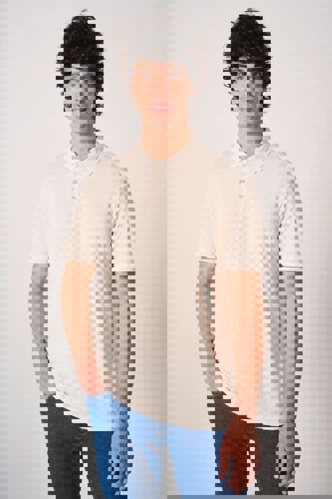 Effen kleuren: 100% katoen. Kleur Ideal Ash Heather: 99% katoen / 1% viscose. Kleur Ideal Oxford Grey: 90% katoen / 10% viscose. Piqué breisel. Rechte snit. Kraag in 1x1 ribboord. Sluiting met 3 toon-op-toon knopen. Toon-op-toon nektape aan de binnenzijde. Zijsplitjes. Mouwboorden en zoom afgewerkt met dubbele stiksels. Afneembaar merklabel.