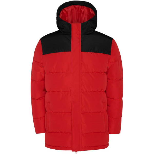 Gewatteerd jack met vaste capuchon. Rits aan de voorkant bedekt met een sluiting. Kinbescherming. Twee zijzakken met rits. Elastische manchetten.