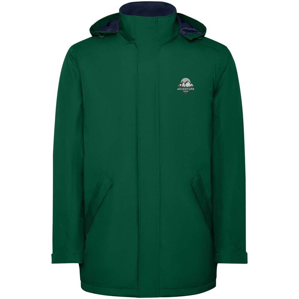 Waterdichte gewatteerde parkajack voor heren. Hoge kraag met omgeslagen en afneembare capuchon met klittenbandsluiting. Bijpassende centrale rits met flap. Zijzakken met rits en vaste klep. Binnenzak met klittenbandsluiting. Verstelbare manchetten met riemlus met klittenbandsluiting. Interne toegang voor verstevigingen op de rug en linkerborst.