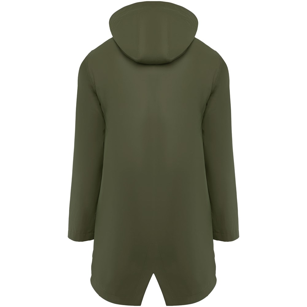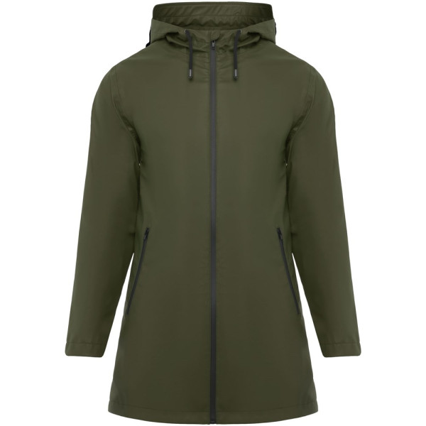 Waterdichte regenjas voor dames. Capuchon met klep. Door hitte gesealde ritsen en naden. Contrasterende details in zwart. Twee zijzakken met rits. Split aan de achterkant. Verwijderbaar etiket. Waterbestendig. Het model is 179 cm en draagt maat S.