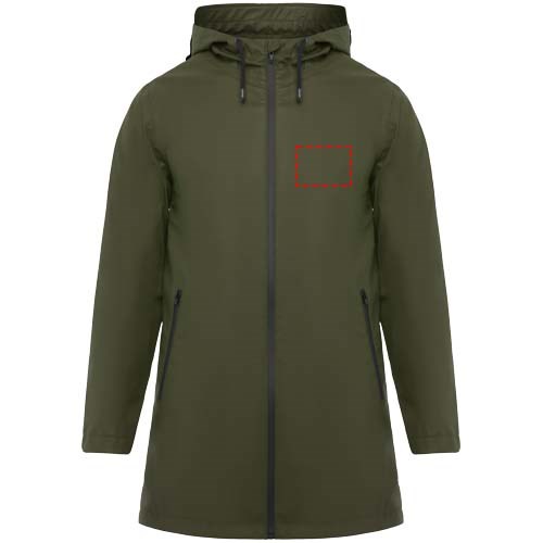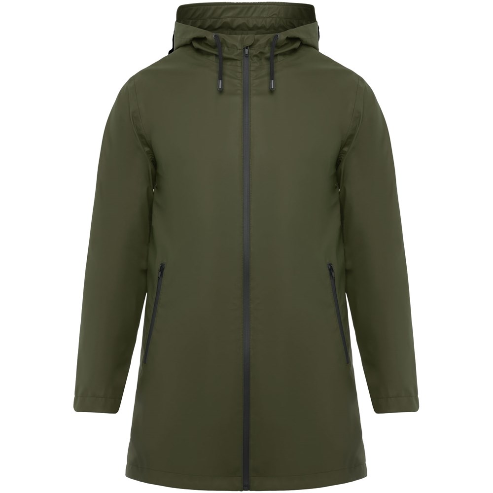 Waterdichte regenjas. Capuchon met klep. Door hitte gesealde ritsen en naden. Contrasterende details in zwart. Twee zijzakken met rits. Split aan de achterkant. Verwijderbaar etiket. Waterbestendig. Het model is 185 cm en draagt maat M.