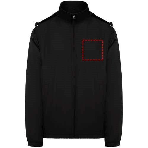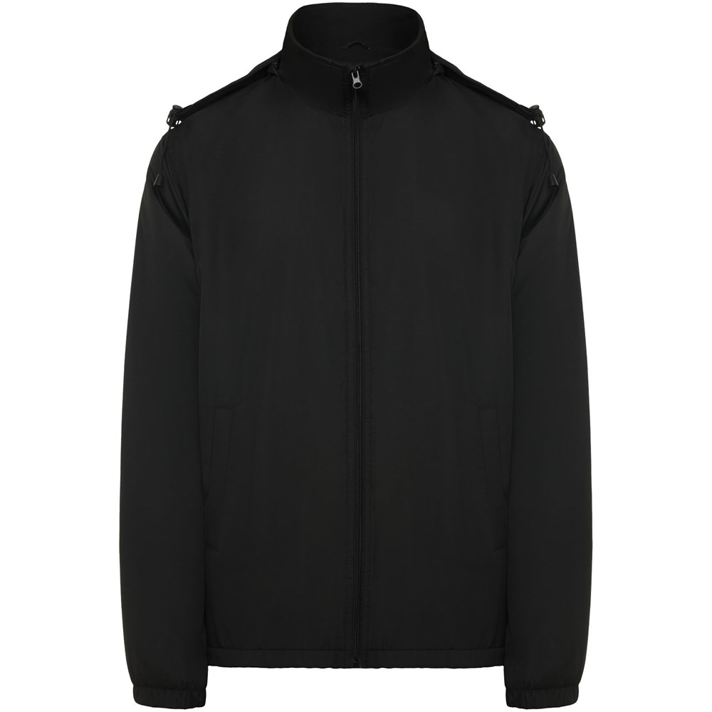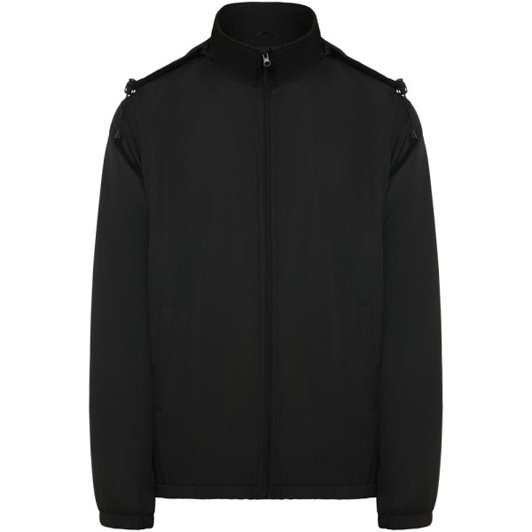 Licht waterdicht jack. Hoge kraag en opvouwbare capuchon met verstelmogelijkheden. Voering van microfleece. Rits aan de voorkant en kinbeschermer. Elastische manchetten. Twee zijzakken met ritssluiting. Binnenzak links op de borst. Verwijderbaar etiket. Waterbestendig. Winddicht. Het mannelijke model is 184 cm en draagt maat L en het vrouwelijke model is 174 cm en draagt maat S.