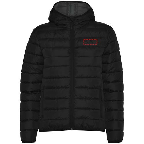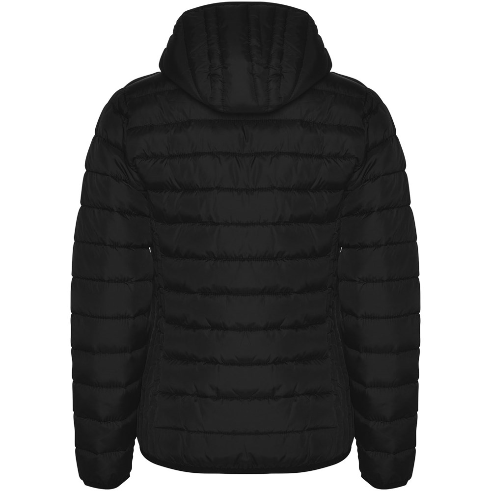Gewatteerd damesjack met dons en aansluitende capuchon. Omgekeerde ritsen met bijpassende kinbeschermer. Twee voorzakken met rits. Bijpassende elastische bies in manchetten, zoom en capuchon. Contrasterende binnenvoering. Licht en opvouwbaar kledingstuk. Nauwsluitende pasvorm. Waterafstotend. Winddicht model.