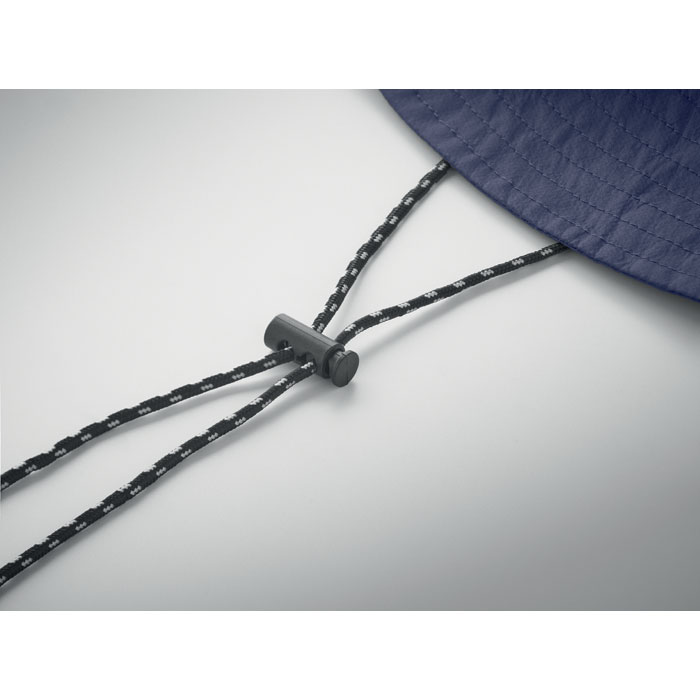 Waterafstotend vissershoedje van polyester, met geïntegreerd zakje aan de binnenkant van hetzelfde materiaal met ABS karabijnhaak. 64g/m².