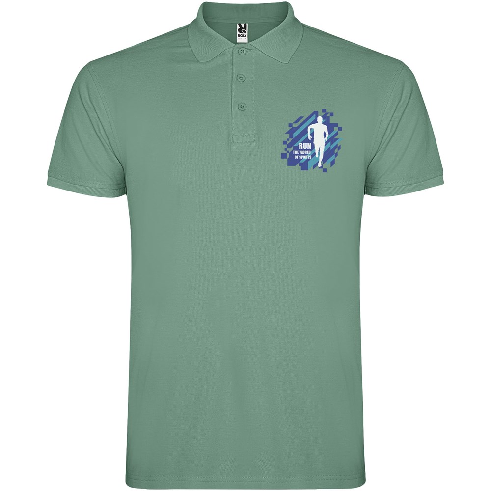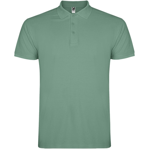 Poloshirt met korte mouwen voor heren. Versterkte bedekte naden in de binnenkant van de kraag. 1x1 geribde manchetten en kraag. Zijnaden. Knoopsluiting met drie knopen en zijsplitten. Optionele zak. Verwijderbaar etiket. Het model is 185 cm en draagt maat L.