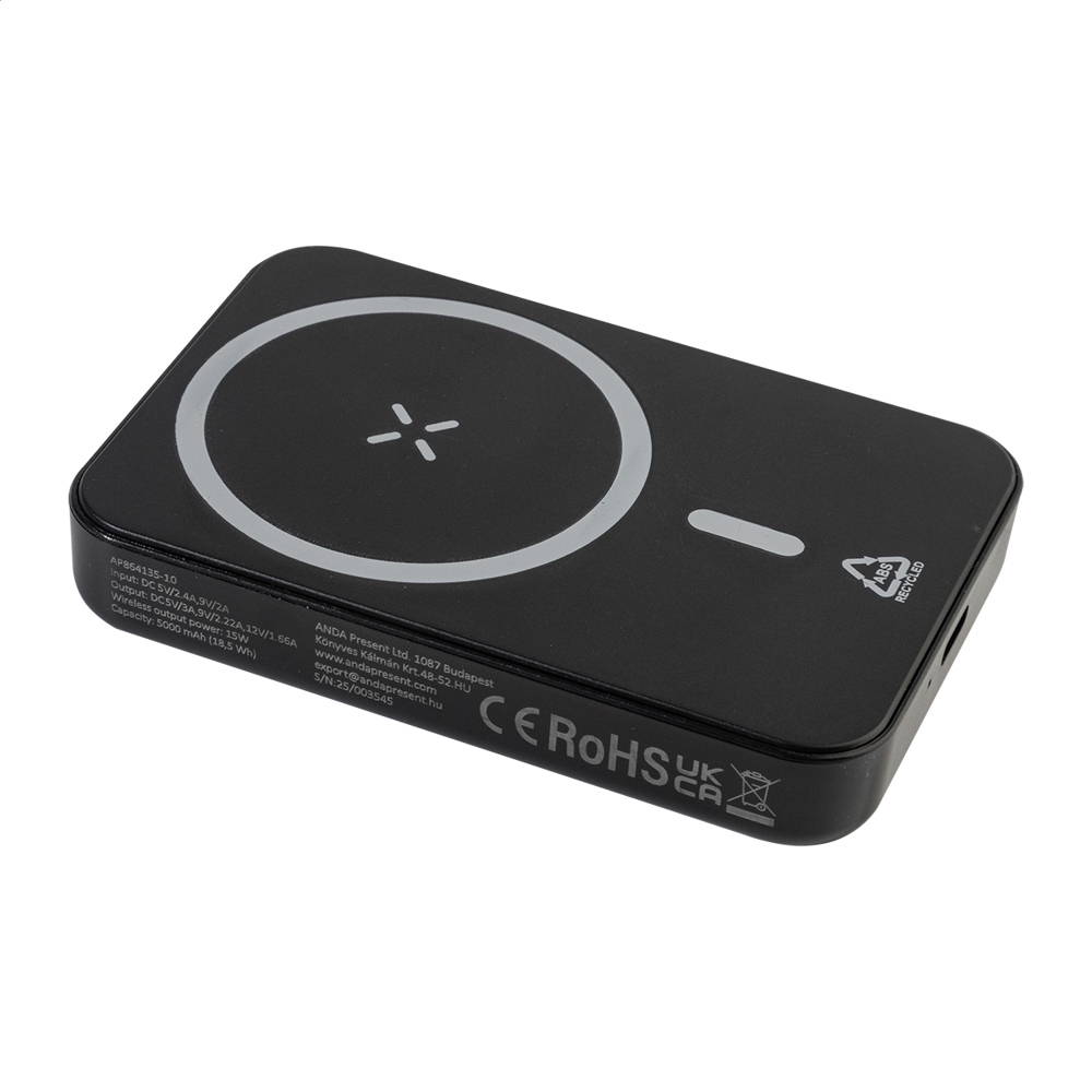 Gerecycleerde ABS powerbank met 5000 mAh batterij en ingebouwde magnetische draadloze snellader...meer