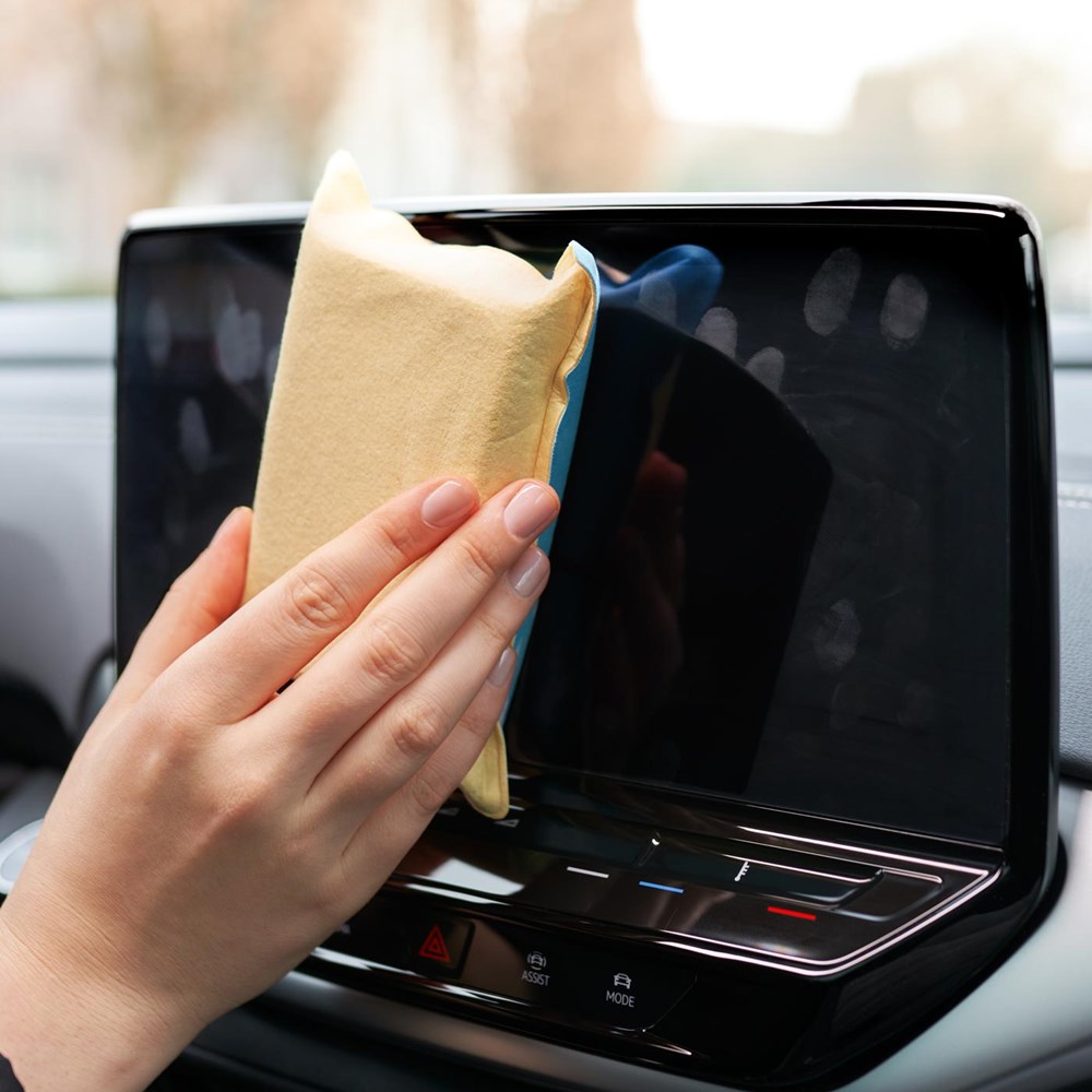 De rPET CarKoser® Premium verwijdert vuil uit de auto: De multifunctionele spons is geschikt als reinigingsspons voor de cockpit, voor het display en voor de voorruit.