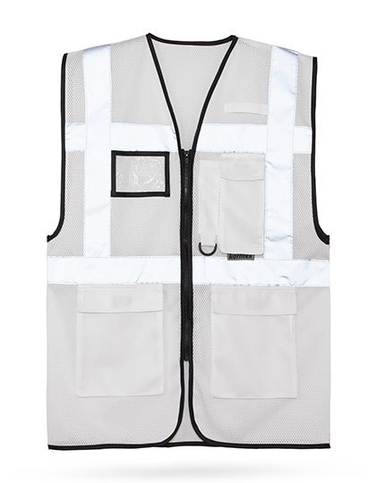 Multifunctioneel vest uit gaas met hoge zichtbaarheid, ritssluiting en zakken | Comfortabel, zelfs bij hoge temperaturen, dankzij de netstof en een losse pasvorm | Twee reflecterende strepen rond het lichaam en over de schouders, elk 5 cm breed, voor goede zichtbaarheid | Met verschillende zakken en een D-ring | Gecertificeerd volgens EN ISO 20471