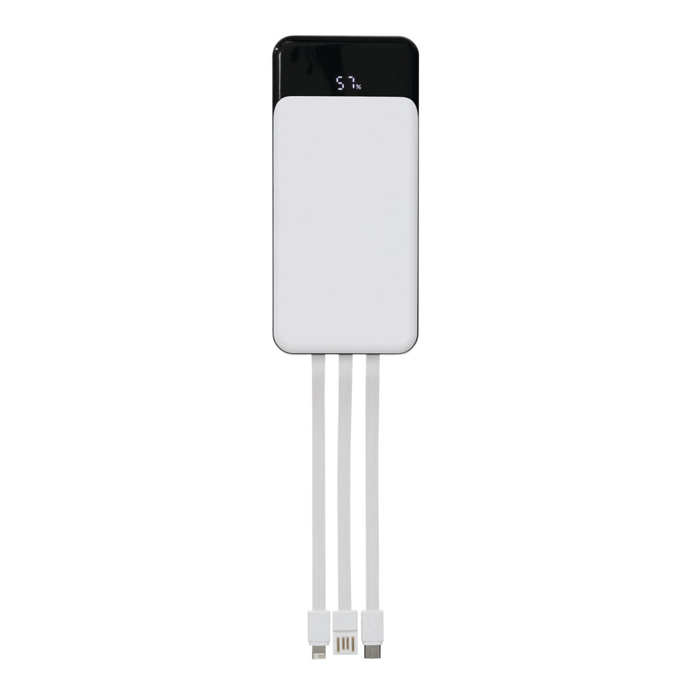 Powerbank POWERSTOCK: geschikt voor smartphones en USB-gevoede apparaten, incl. 3 geïntegreerde laadkabels aan de achterkant (USB-C, Lightning®, USB-A), met laadniveau-indicator in procenten, aan-/uitschakelaar, 2 USB-C in-/uitgangen en 1 USB-A uitgang, invoer: 5V/2A, uitvoer: 5V/2A (max.), capaciteit: 10.000 mAh, krachtige lithiumaccu, verpakt in een doos