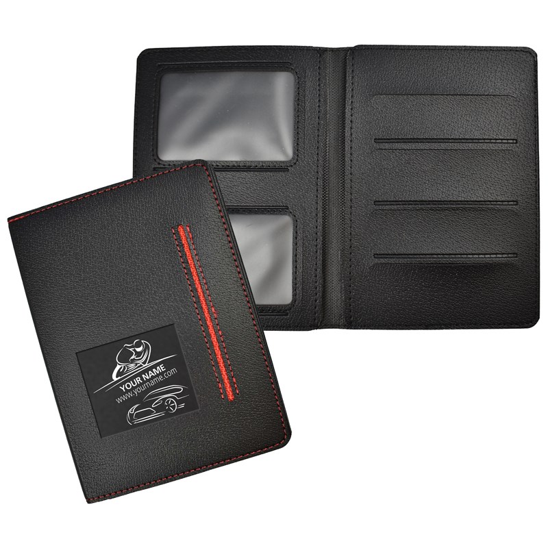 Robuust kunstlederen kentekenetui met in totaal ruimte voor 6 creditcardformaat pasjes en 2 insteekmogelijkheden voor gevouwen papieren. Leverbaar met grijs, geel, rood of blauw accent. Geschikt voor blindlas.