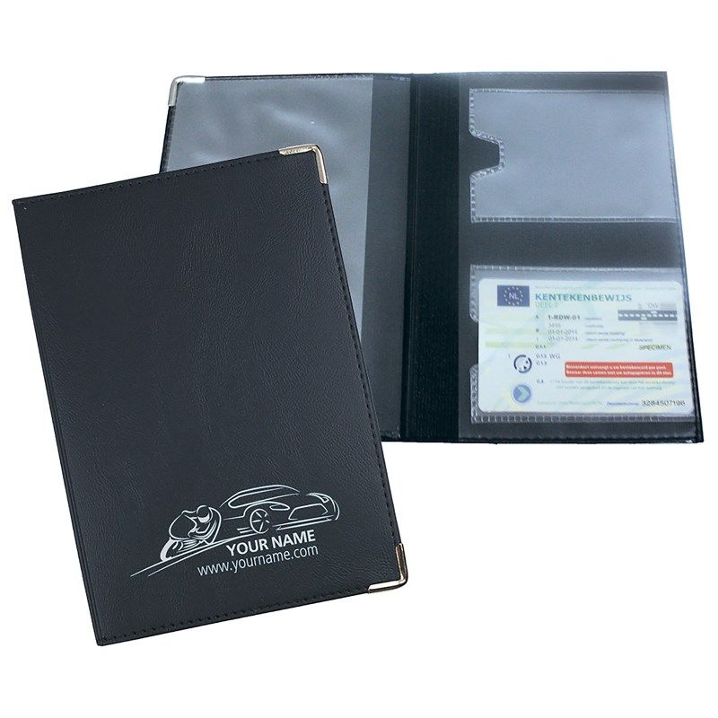 Kentekenetui met 3-delig transparant binnenwerk en 2 extra creditcardvakjes voor o.a. de kentekencard. Aan de voorzijde zitten 2 metalen beschermhoekjes.