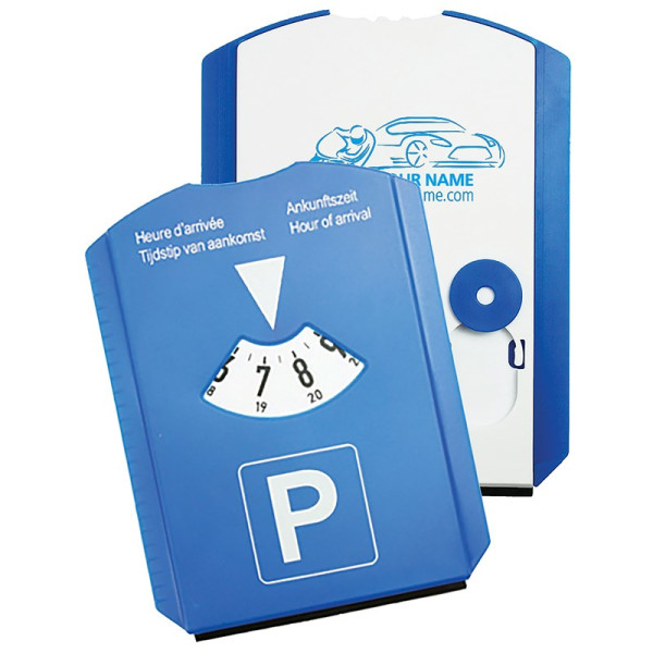 Op sommige plekken mag je met je auto maar een beperkt aantal uren geparkeerd staan. Een verplicht item in je auto dus. Met aan de achterzijde drie muntjes voor je boodschappenkarretje. Ook mogelijk om de parkeerschijf te bedrukken met bedrijfsnaam of logo. Bij lichte vorst of sneeuw ook te gebruik als ijskrabber.