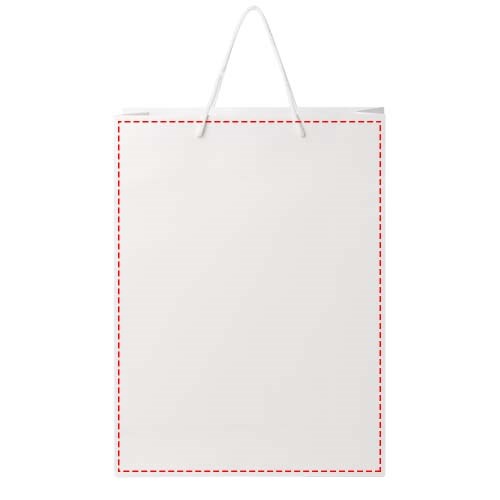 XL handgemaakte matte integra papieren tas (31 x 12 x 41 cm) van 170 g/m2 met PP woven handgrepen. De aanpasbare voor- en achterkant bieden voldoende ruimte voor het afdrukken van een logo of een ander ontwerp, waardoor het een uitstekende zakelijke marketingtool is. Gemaakt in Europa en 100% recyclebaar.