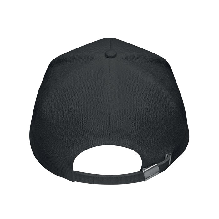 Baseballpet met 5 panelen van 100% hennep, 370 gr/m², met messing verstelbare sluiting en 5 geborduurde oogjes in de kleur van de cap. Maat 58 cm.