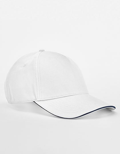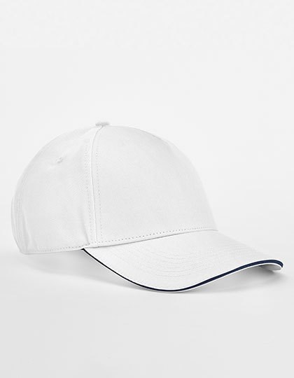 Biologische katoenen keperstof | 5-panelen design | Contrasterende kleur sandwich piek | Gestikte ventilatieogen | Drievoudige schuifversteller in contrasterende kleur | Afscheurbaar etiket