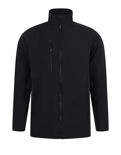 Moderne, 2-lagige softshell jas, in unisex pasvorm, met gebonden microfleece aan de achterkant | Moderne stijlkenmerken: contrasterende, stretchende zijpanelen in mergmotief en rits centraal vooraan met anti-slip rits, verborgen zijzakken met rits, borstzakje, langer ruggedeelte, ingezet stuk aan de schouders en diepe binnenzakken voor mobiele telefoon en accessoires | Henbury uitgesneden label voor eenvoudige rebranding | Ademend zijpaneelstof voor extra comfort
