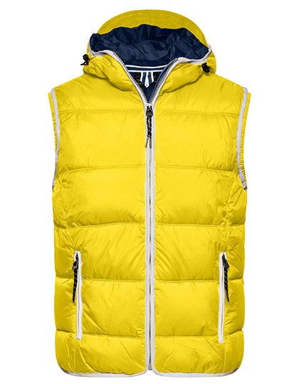 Modieus gewatteerd vest met capuchon | Matoppervlak met lichte TPU-coating | Wind- en waterafstotend (600 mm waterkolom) | Twee voorzakken | Binnenborstzak | Stormflap over de volledige lengte | Contrasterende naden | Elastisch koord met stopper op capuchon | Elastisch armsgat voor een perfecte pasvorm | Rits voor decoratie aan de achterkant