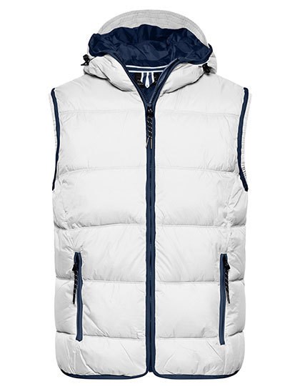 Modieus gewatteerd vest met capuchon | Matoppervlak met lichte TPU-coating | Wind- en waterafstotend (600 mm waterkolom) | Twee voorzakken | Binnenborstzak | Stormflap over de volledige lengte | Contrasterende naden | Elastisch koord met stopper op capuchon | Elastisch armsgat voor een perfecte pasvorm | Rits voor decoratie aan de achterkant