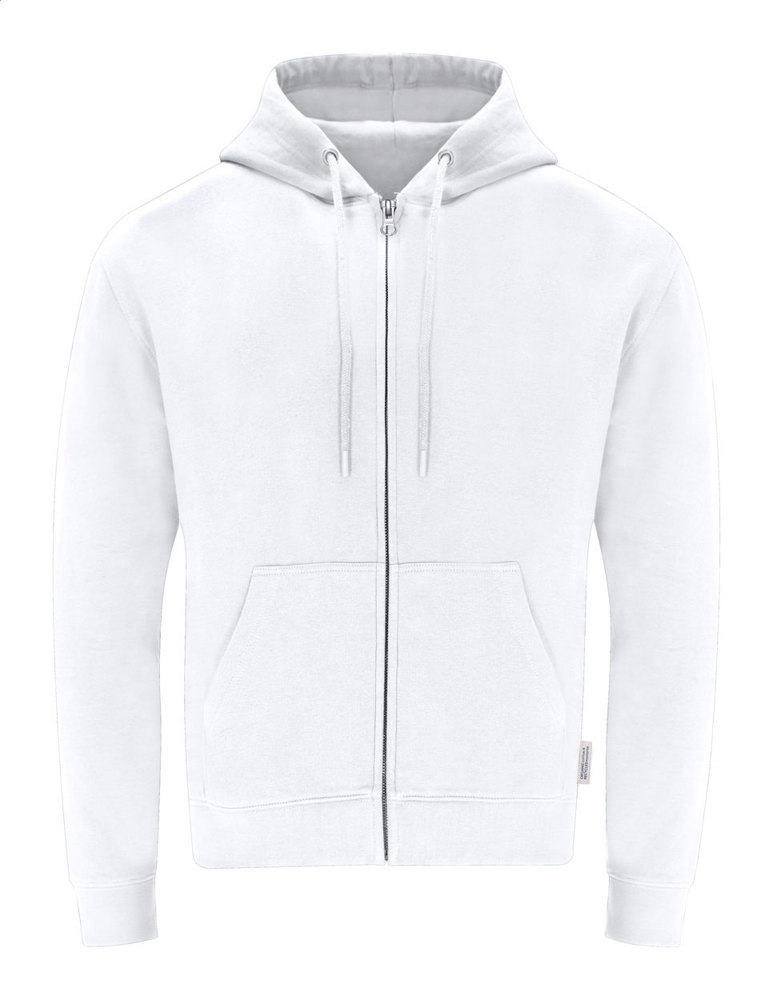 Sweatshirt met capuchon en rits en voorzakken van 60% biologisch katoen en 40% RPET polyester, 280 g/m2.
