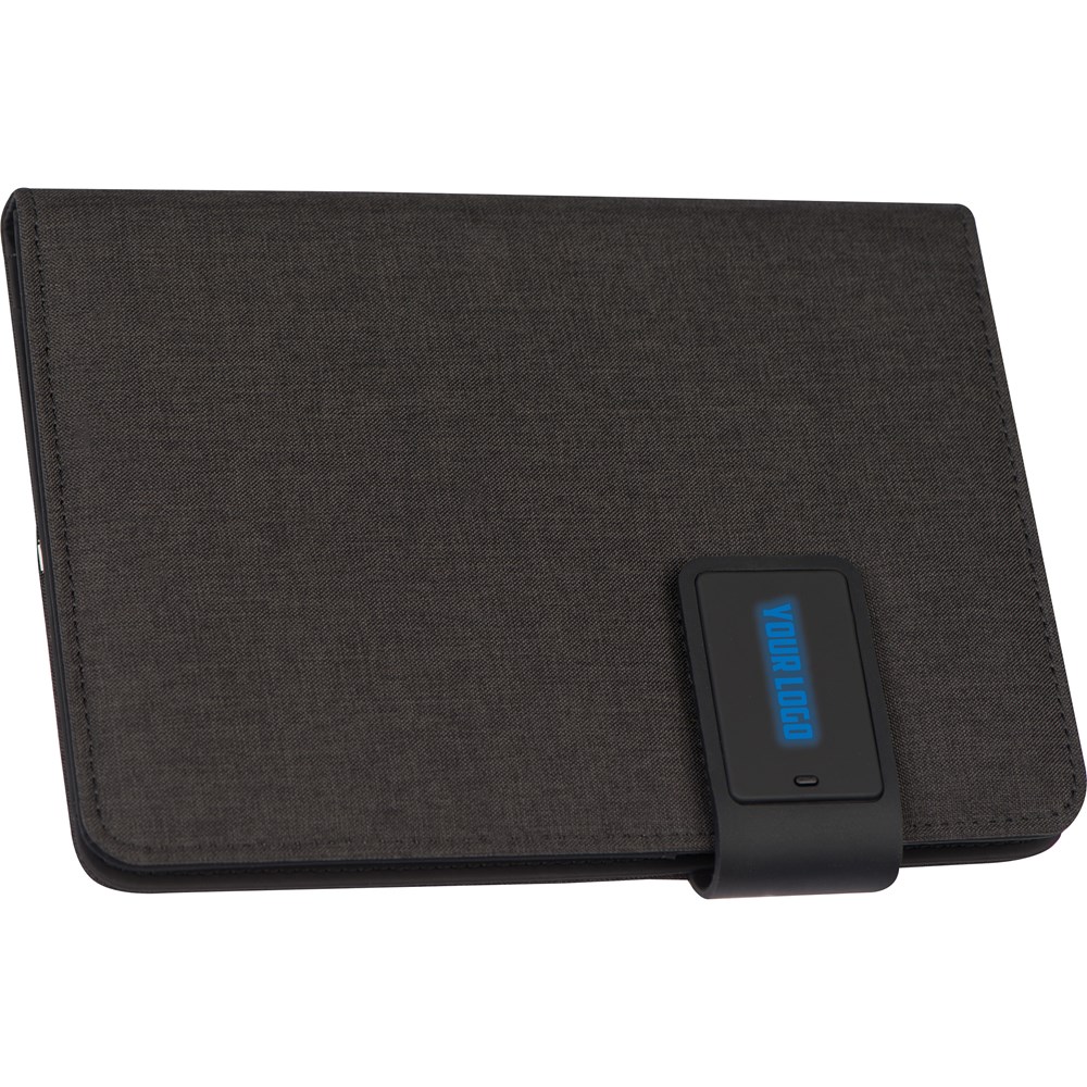 A5 Schrijfmap met geïntegreerde powerbank van 4000 mAh, diverse vakken, pennenlus, houder voor een Smartphone en een USB-kabel. In de magneetsluiting is een LED-licht verwerkt, waardoor uw reclame in de betreffende kleur opgelicht wordt.