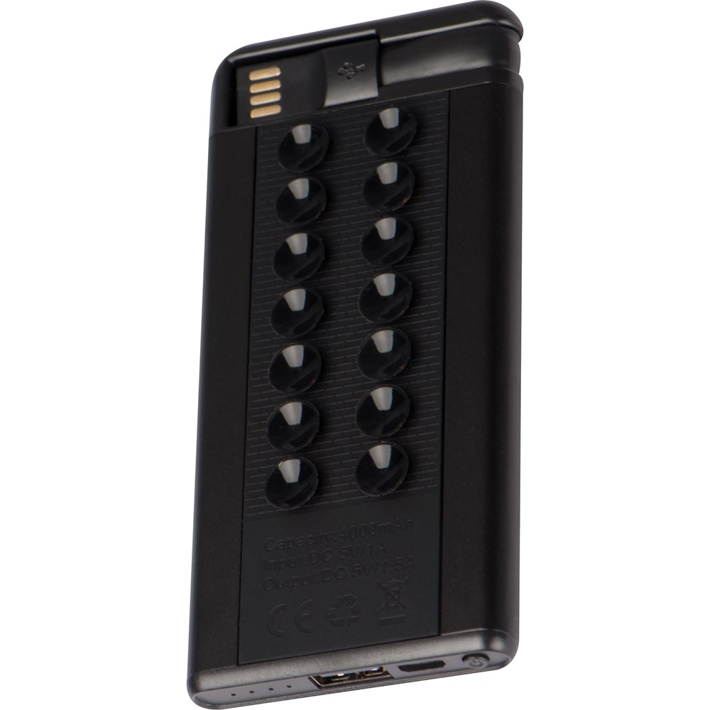 Krachtige Powerbank met een vermogen van 4000 mAh. Door de zuignappen kan deze powerbank handig aan de Smartphone bevestigd worden. Kabel inclusief. Uw reclame wordt middels een druk op de voorzijde aangebracht.