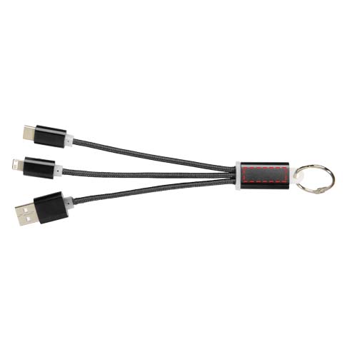 Metalen 3-in-1 oplaadkabel met sleutelring. De metalen 3-in-1 oplaadkabel met sleutelring beschikt over 1 type C, 1 USB type A en een 2-in-1 dubbel uiteinde dat compatibel is voor zowel Apple iOS als Android apparaten. Wordt geleverd met een sleutelhanger. Om Apple apparaten op te laden steekt u het kabeluiteinde zonder pinnen in het apparaat, en voor het opladen van Android apparaten steekt u het uiteinde met pinnen in het apparaat.