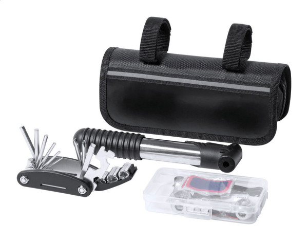 Fietsreparatieset in praktische frametas. Inclusief: multitool met 15 functies, inbussleutel, minipomp en bandenreparatieset (2 bandenlichters, rasp en 6 pleisters). 600D polyester.